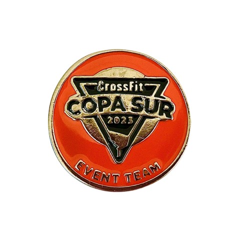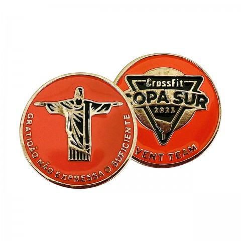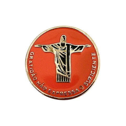 Peça feita em zamac, com acabamento em Ouro, resinado em cores frente e verso.